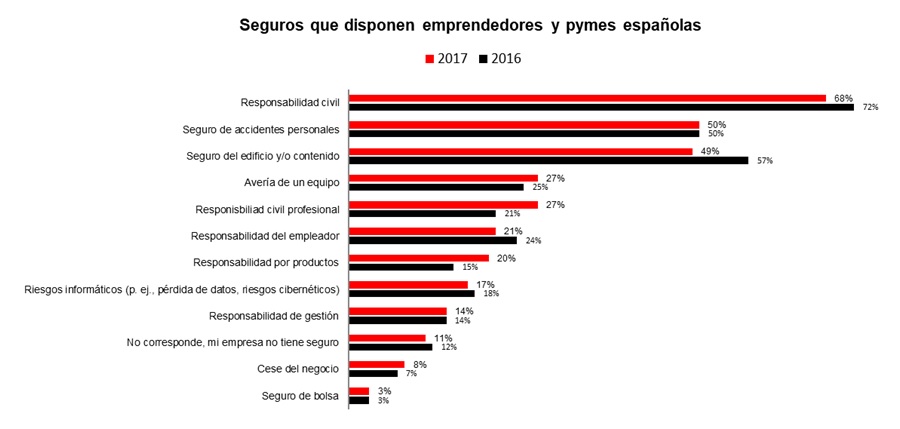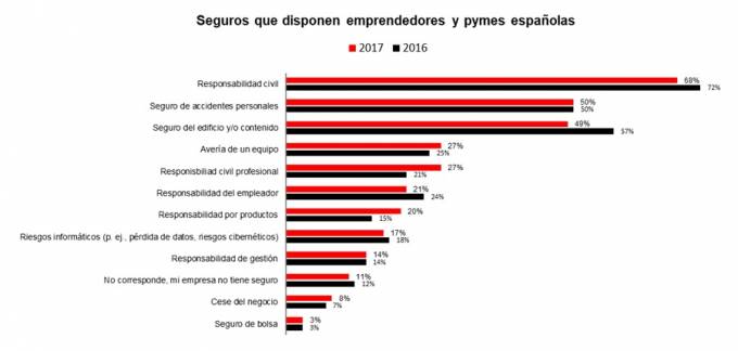 Otro resultado destacable es el crecimiento de pequeñas empresas con seguro de RC productos. Los datos globales arrojan una subida de dos puntos, del 13% al 15%. Destaca el salto que se ha producido en España que ha pasado del 15% al 20%. En el caso de los seguros de avería de un equipo crecen dos puntos en 2017 (del 25 al 27%).