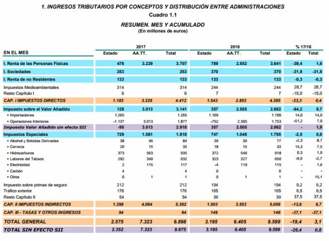 Los ingresos tributarios del Estado y las comunidades autónomas ascendió en septiembre a los 9.898 millones, con un ascenso del 3,1% de las administraciones territoriales (7.323 millones) y una caída de más del 19% por parte del Estado (2.575 millones). En los 9 primeros meses el total de las administraciones ha recaudado 135.291 millones, un 5,3% más.