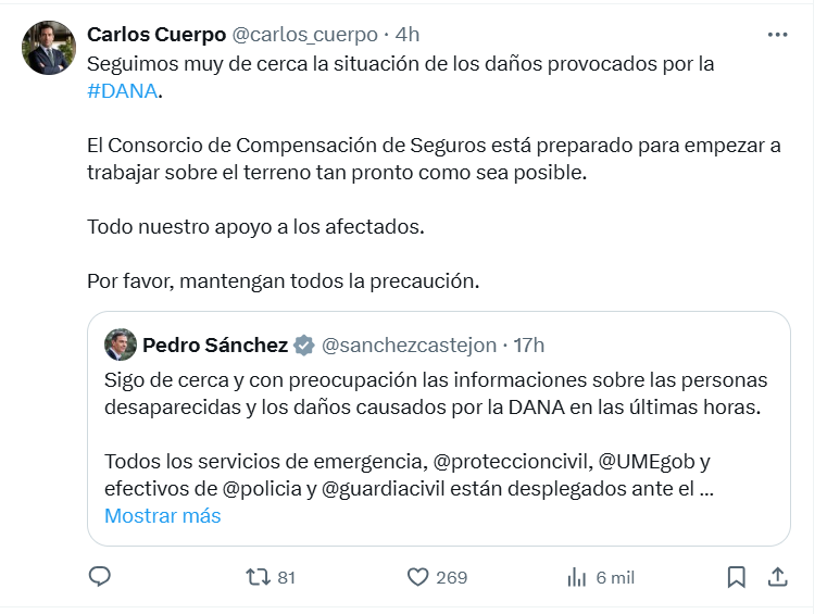Por su parte, el ministro de Economía, Comercio y Empresa, Carlos Cuerpo, ha escrito un comentario en la red social X donde señala que sigue de cerca la situación de los daños provocados por la DANA. Asegura, además, que el CCS "está preparado para empezar a trabajar sobre el terreno tan pronto como sea posible". En el escrito manda también "todo nuestro apoyo a los afectados" y pide, por favor, que se mantenga la precaución.