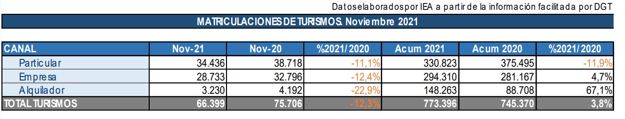 Entre enero y noviembre de 2021, se han vendido 773.396 unidades, un 4% más que en los once primeros meses de 2020 pero un 33% menos que en el mismo periodo de 2019.