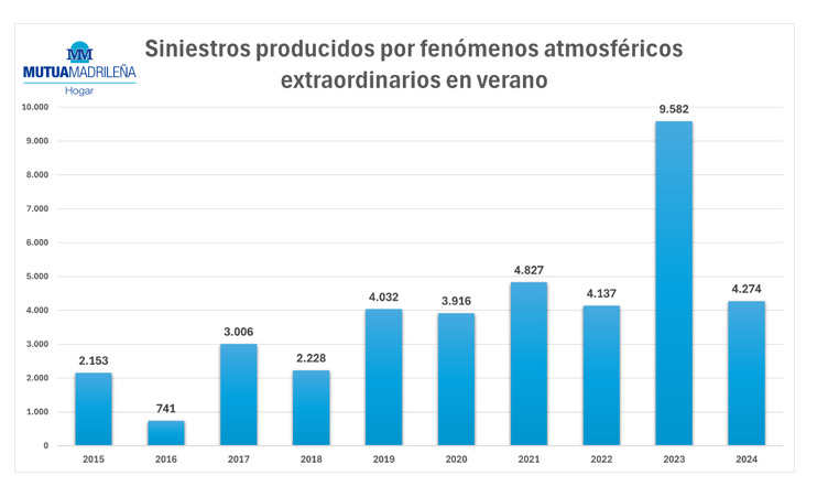 El informe de la aseguradora muestra que en la última década, los siniestros por fenómenos atmosféricos registraos en los meses de verano por la propia compañía se han duplicado y han pasado de los 2.100 de 2015 a los 4.200 de 2024. Destaca que en 2023 la cifra fue "extraordinariamente alta" y los siniestros sumaron casi 9.600 por una DANA de principios de septiembre.