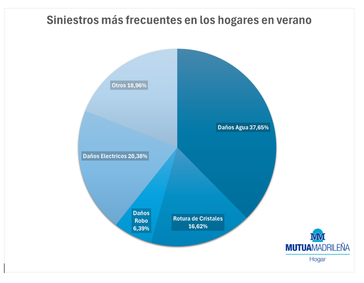 Al margen de los daños eléctricos, la primera causa de siniestro en verano son los daños por agua que tienen una incidencia del 37,6% del total. La rotura de cristales es la tercera causa con el 16,6%.