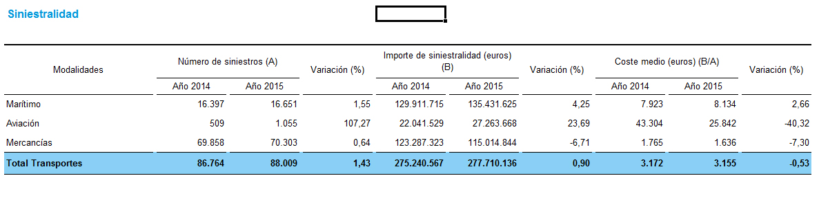 En Mercancías se registraron 70.303 siniestros (+0,64%), con un importe total de 115 millones de euros (-6,71%) y un coste medio por siniestro de 1.636 euros (-7,3%). En Marítimo el número de siniestros fue de 16.651 (+1,55%) y el importe subió a 135,43 millones de euros (+4,25%), además de un alza del 2,66% en el coste medio, que se elevó a 8.134 euros.
