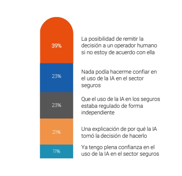 Para el resto, entre los motivos que harían que aumentara su confianza en el uso de la IA en el ámbito de los seguros, un 39% querría poder contactar con una persona en caso de no estar de acuerdo con el asistente virtual, un 23% indica que su confianza aumentaría si el uso de la IA en seguros estuviera regulado de manera independiente y un 21% considera importante que la IA le proporcione una explicación de por qué ha tomado esa decisión.