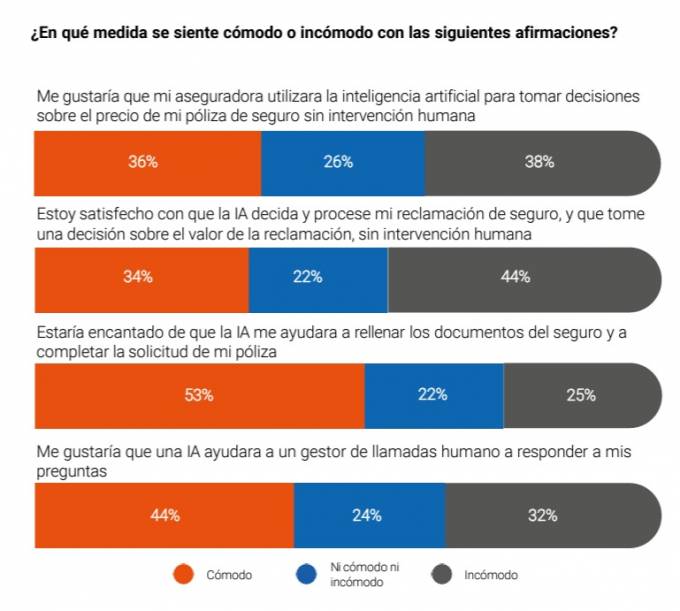El uso de la IA en tareas de asistencia, como completar documentos de seguros, es bien recibida por un 53% de los españoles. Sin embargo, solo un 36% de los españoles se muestra cómodo con la idea de que su aseguradora utilice IA para decidir el precio de su póliza sin intervención humana y un 34% está satisfecho con la posibilidad de que la IA procese y decida sobre reclamaciones.