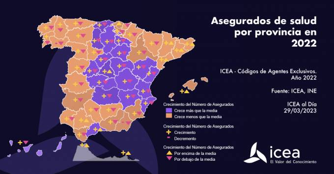 Al cierre de 2022, el número de asegurados del ramo de Salud creció un 3,73% a nivel nacional respecto al cierre del año anterior, según los datos de ICEA. Por provincias, destacan los aumentos registrados en Soria, Alicante y Ávila, que superaron ese crecimiento, con un 10,8%, 9,1% y 6,9%, respectivamente. En cambio, solo hubo dos provincias que mostraron descenso en el número de asegurados.