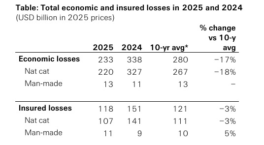 Explica la reaseguradora que estas cantidades se deben principalmente a los incendios forestales ocurridos en Los Ángeles durante el primer trimestre de este año y también a las tormentas convectivas severas (SCS). Este evento ocurrido en la costa oeste de Estados Unidos fue el más costoso a nivel mundial y registró pérdidas de 40.000 millones. El huracán Melissa fue el de mayor pérdida de este año arrojando unas pérdidas por valor de 2.500 millones en una temporada "benigna".