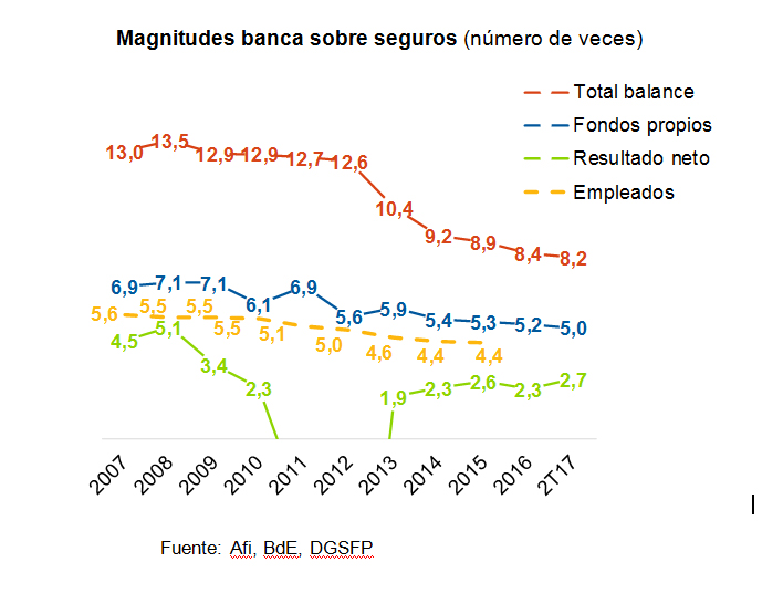 Desde el inicio de la crisis (2007) hasta el 2º trimestre de 2017 el tamaño del balance de los bancos se ha contraído un 11% mientras que el de los seguros se ha incrementado un 40%. En el caso de los recursos propios, ambos los han incrementado, pero la recapitalización del sector asegurador ha sido más intensa, un 80%, frente al 32% de la banca. Además, la recapitalización en seguros ha sido mayoritariamente de origen interno, y en el segundo de origen externo, y en gran parte de carácter público. Respecto a los resultados, en banca y en seguros han descendido, "pero el descenso ha sido más estable en seguros y más espasmódico en banca".
