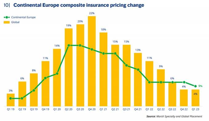 A nivel mundial, las tarifas de los seguros comerciales han aumentado un 4% en el primer trimestre de 2023, manteniendo así el ritmo de crecimiento con el que se finalizó el ejercicio 2022, según se extrae del Índice Mundial del Mercado de Seguros que ha publicado Marsh. Con esta subida, ya van 22 trimestres consecutivos al alza.
