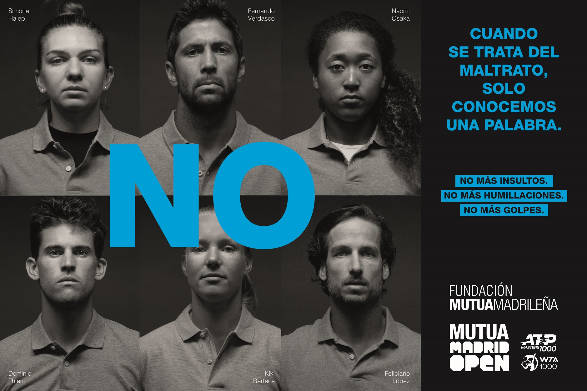 Naomi Osaka, Dominique Thiem, Fernando Verdasco, Elina Svitolina, Feliciano Lopez, Kiki Bertens, Pablo Carreño, Alexander Zverev, Simona Halep, Angelique Kerber, Carla Suarez, Juan Martín del Potro y Karolina Pliskova son las figuras del tenis que han participado en la pieza audiovisual de este año que responde a un lema directo y rotundo como es "NO".