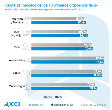 El seguro español en términos generales -contabilizando la cuota de mercado de los 10 primeros grupos- se ha concentrado en este 2021 con los datos de ICEA. Lo han hecho todas las líneas de negocio excepto el ramo de Autos donde los primeros del ranking han perdido algo de negocio. En 2020 sumaban el 85,6% de las primas y al cierre de diciembre su cuota era un 0,2 pp menos.