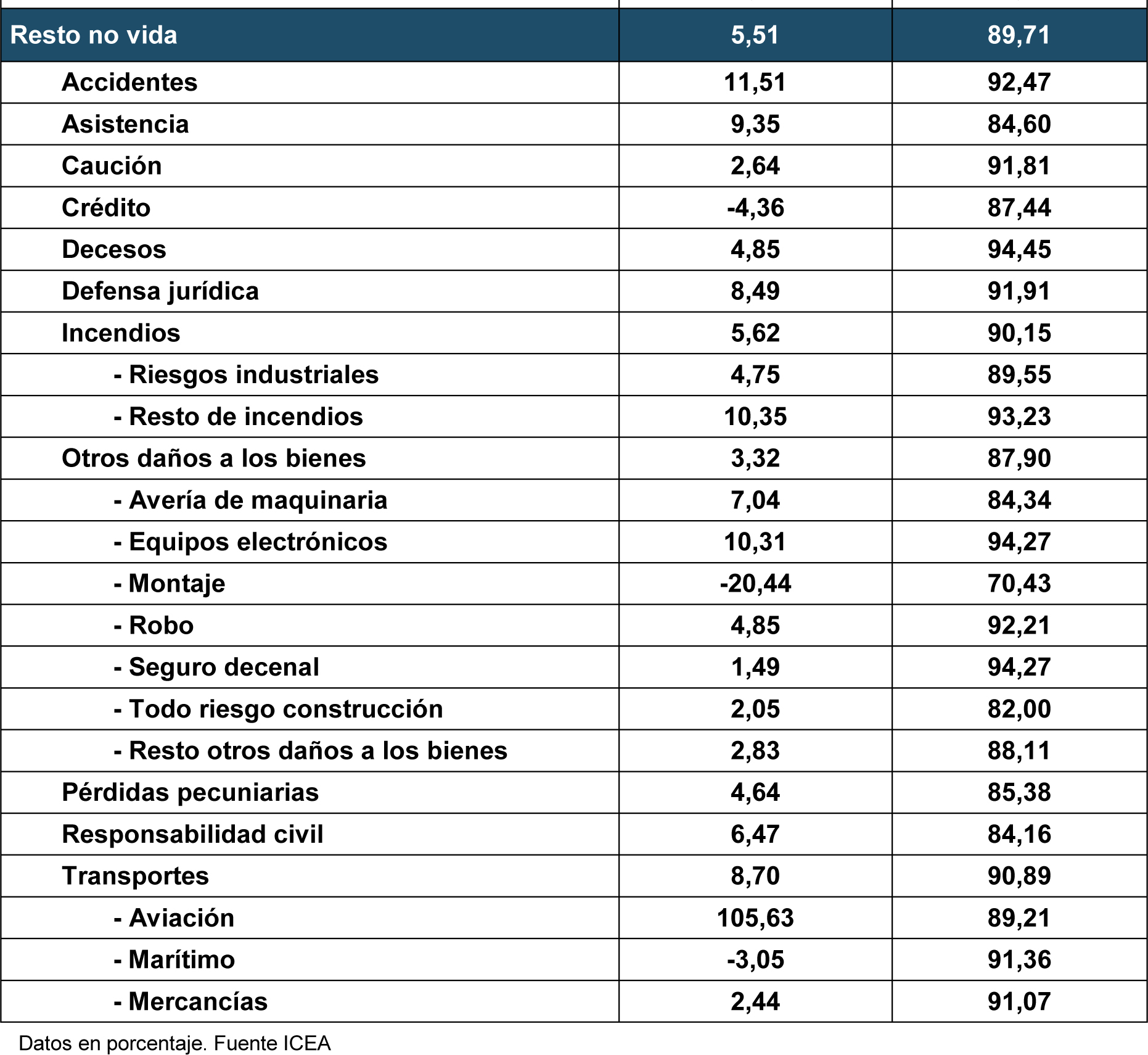 Dentro de los seguros 'Resto No Vida' los que más crecen son los seguros de Accidentes, un 11,51%; Asistencia, un 9,35%; Transportes, un 8,7%; y Defensa Jurídica, 8,5%. Respecto a la evolución del año anterior, destaca la buena marcha de Caución, que ha pasado de caer en primas un 34,57% a experimentar un avance del 2,64%; y Decesos, que crece un 4,85% frente a la caída del 0,16% de hace un año. Otro dato a tener en cuenta es el hecho de que solo el ramo de Crédito mantiene su tendencia al descenso de primas (-4,36%), que incluso se ha ahondado respecto al año anterior (-1,93%).