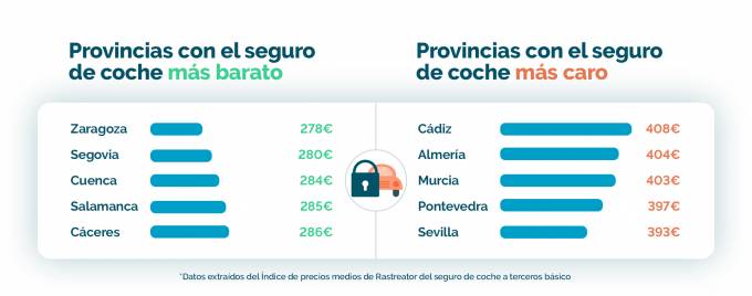 Las provincias donde se registra el precio más barato para ese seguro son Zaragoza (278 euros anuales), Segovia (280 euros), Cuenca (284 euros), Salamanca (285 euros) y Cáceres (286 euros), debido a que registran menos tráfico y, en consecuencia, un índice bajo de siniestralidad. Mientras, las más caras son Cádiz (408 euros anuales), Almería (404 euros), Murcia (403 euros), Pontevedra (397 euros) y Sevilla (393 euros).