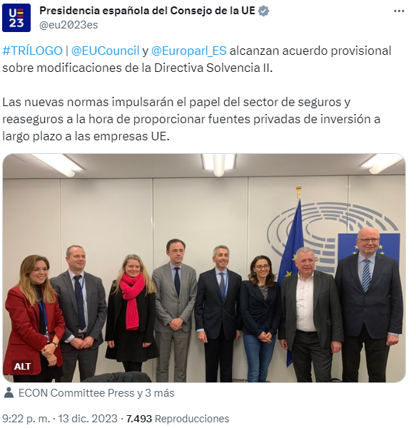 Los legisladores de la UE han acordado una serie de reformas en la Directiva de Solvencia II. El acuerdo se ha alcanzado entre los Estados miembros, representados por la Presidencia española de la UE -con la presencia del director general de Seguros y Fondos de Pensiones, Sergio Álvarez- , y los negociadores del Parlamento Europeo, liderados por Markus Ferber. Cabe recordar que este proceso de revisión comenzó en febrero de 2019.