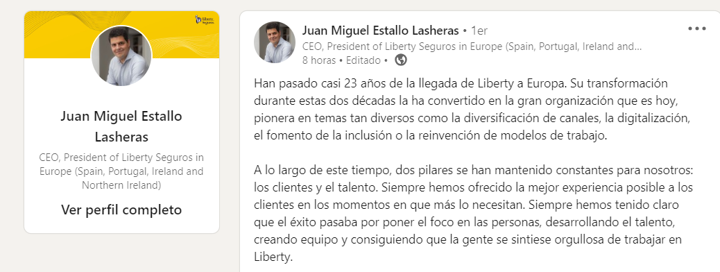 Estallo, que ha sido CEO de la compañía para los 3 negocios vendidos a Generali -España, Portugal e Irlanda- recuerda que "han pasado casi 23 años de la llegada de Liberty a Europa" y apunta que "su transformación durante estas dos décadas la ha convertido en la gran organización que es hoy, pionera en temas tan diversos como la diversificación de canales, la digitalización, el fomento de la inclusión o la reinvención de modelos de trabajo".