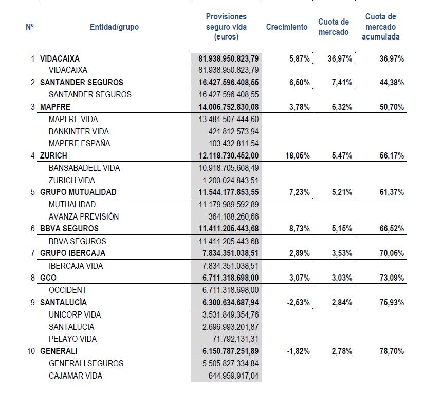Por compañías, VidaCaixa sigue líder del ramo con una cuota de mercado del 36,9%, un crecimiento del 5,87% y un patrimonio de 81.938 millones de euros.