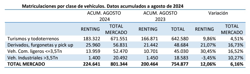Hasta el mes de agosto las matriculaciones de vehículos registradas por las compañías de renting alcanzaron las 224.641 unidades, un 12,06% más que en el mismo periodo de 2023, cuando se contabilizaron 200.464 vehículos.