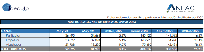 El mercado de turismos y todoterrenos ha aumentado un 8,3% en mayo, con un total de 92.025 unidades matriculadas, según datos facilitados por Anfac, Faconauto y Ganvam. Estas asociaciones explican que "la mejoría en los ritmos de producción está permitiendo responder con mayor agilidad a los pedidos procedentes de los concesionarios; principalmente, de los canales de rent-a-car y empresas, que son los que están impulsando las cifras". Por su parte, las ventas a particulares se sitúan todavía un tercio por debajo del ritmo previo a la pandemia.