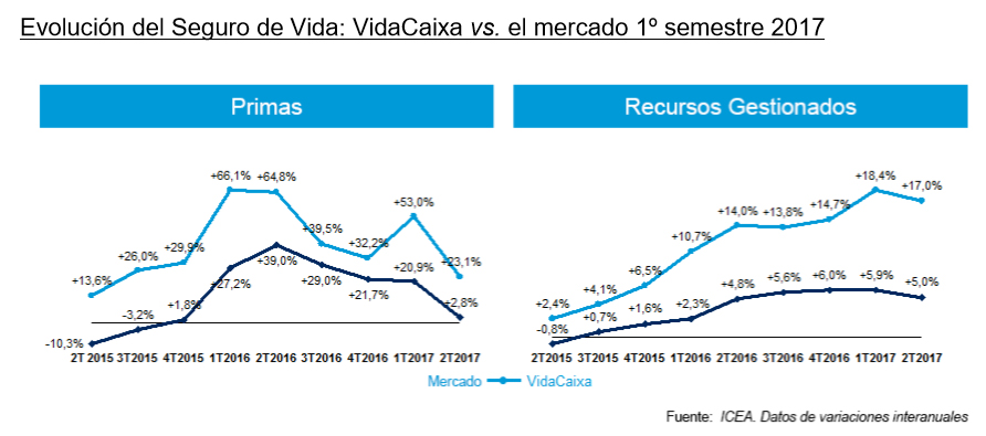 En un semestre donde a nivel sectorial el negocio de Vida se ha resentido (crece hasta junio un 2,8% frente al 38,9% de 2015) VidaCaixa ha vuelto a crecer consolidando su posición de líder del mercado español. En los primeros 6 meses del año ha logrado un volumen de primas de 5.597 millones de euros, con un avance del 23,1%, a un ritmo lejano del primer trimestre cuando avanzaba un 53%. Esto le hace aumentar su cuota de mercado en Vida hasta el 34,5% mejorando en casi un 6% y escalar un 0,9% en Pensiones hasta el 23,4%.