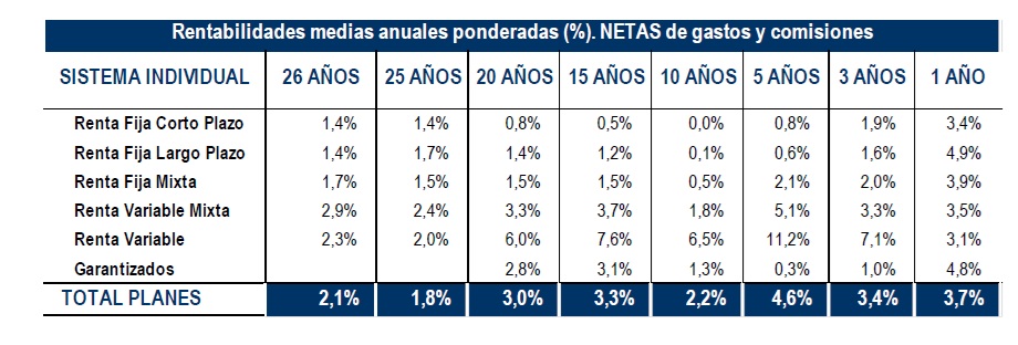 Los planes de Renta Fija y los Garantizados han sido las dos modalidades que mejor aguantan las incertidumbres con unas rentabilidades del 4,9% y 4,8% respectivamente, aunque a más largo plazo (5 años) la categoría de Renta Variable aporta una rentabilidad media anual superior al 11%.