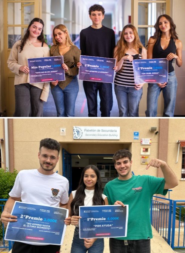 La X edición del concurso "Nos duele a todos" convocado por Fundación Mutua Madrileña ha premiado El video "No apartes la mirada" de Hugo Camúñez, alumno del IES Lope de Vega en Madrid, en la categoría de enseñanzas medias (ESO, Bachillerato y FP Grado Medio) y "Pide ayuda" de María Trelles y Cristian Muñoz, del Colegio Severo Ochoa de Murcia, que se ha hecho con el primer premio en enseñanzas superiores (Grado, Posgrado y FP Grado Superior).