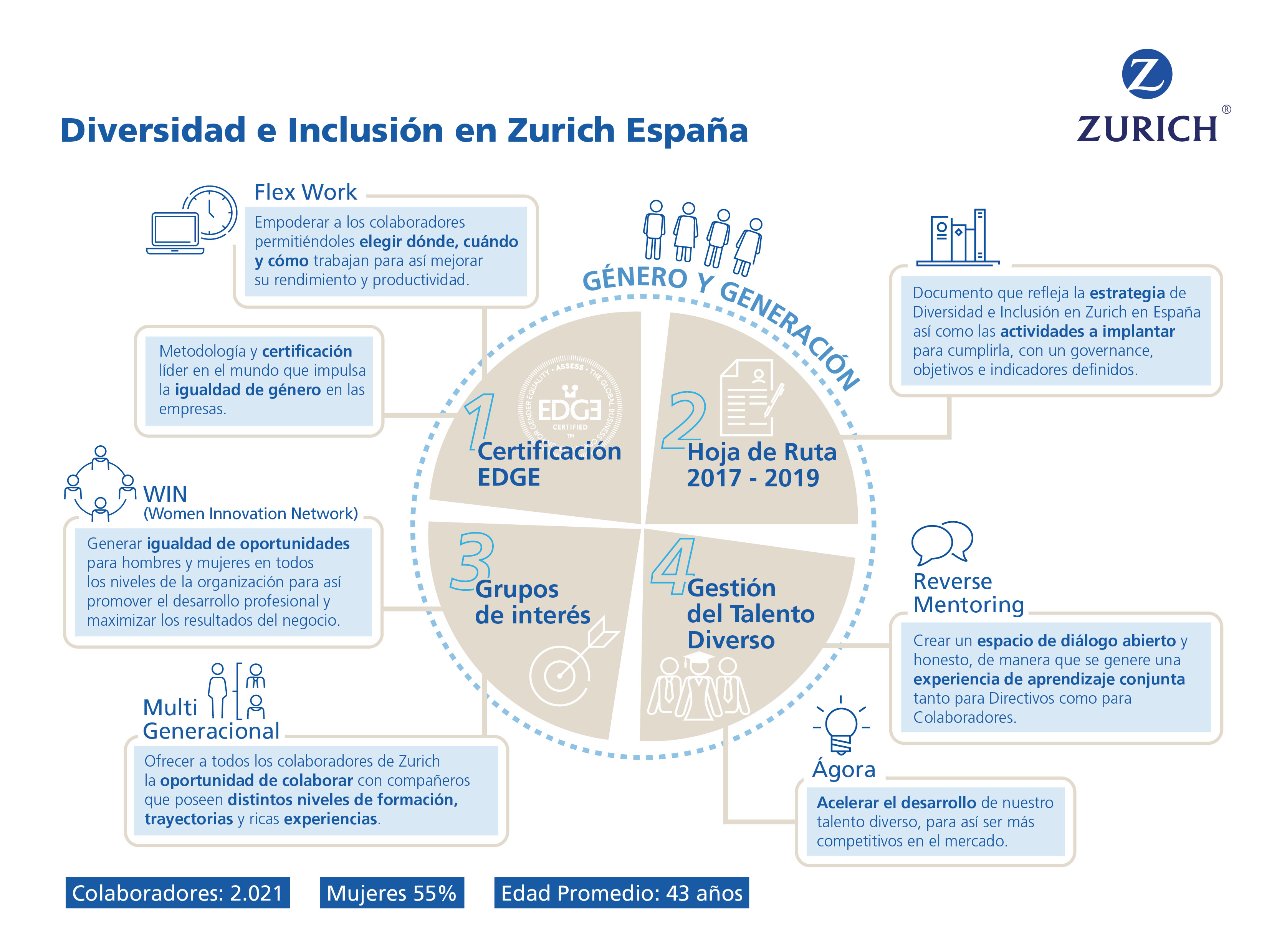 Zurich Seguros ha puesto en marcha el trabajo flexible (Flexwork) para su plantilla en España. Se trata de una nueva forma de trabajar que permite al empleado gestionar su tiempo, compaginando la vida personal con la laboral. Esta iniciativa promueve que los colaboradores tengan la capacidad de trabajar de la forma que mejor se adapte a sus necesidades, sin las limitaciones convencionales de horario, lugar y forma de trabajar, un máximo de 20 horas a la semana.