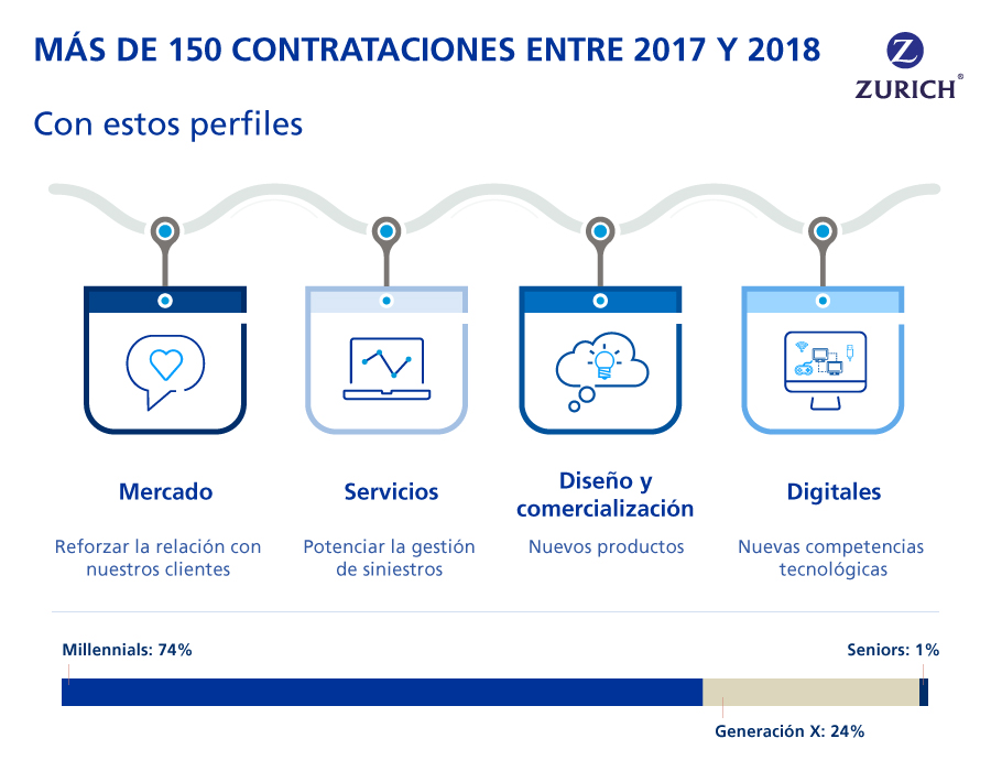 Zurich se encuentra en proceso de incorporar talento a la empresa y rejuvenecer así su plantilla. Entre el pasado año y el presente quiere incorporar un total de 150 nuevos profesionales con el objetivo de "reforzar áreas clave para la transformación digital", principalmente relacionados con los departamentos de Siniestros, Empresas, Finanzas y Digital.