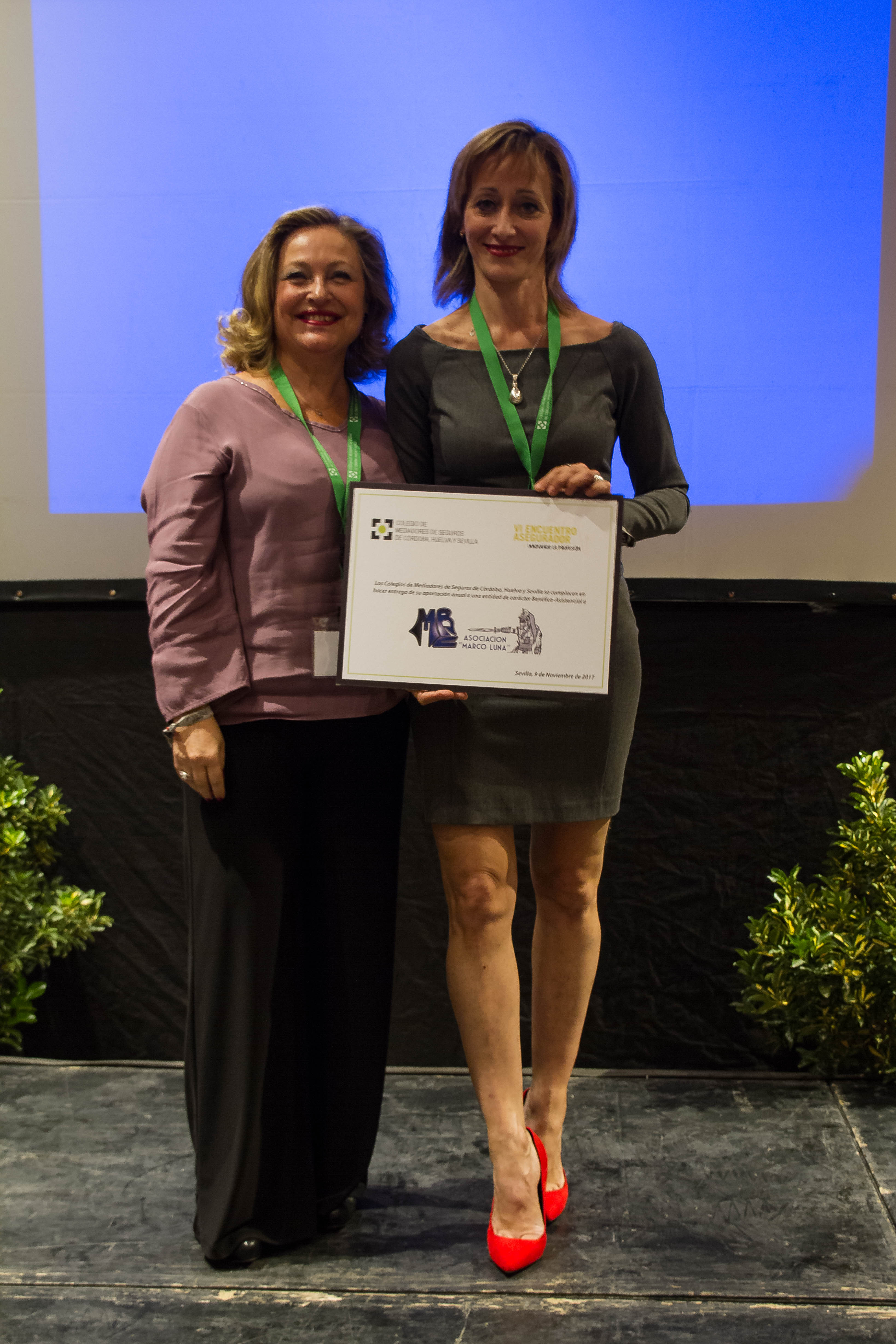 Los Colegios de Mediadores de Seguros de Córdoba, Huelva y Sevilla han entregado su aportación anual solidaria a la Asociación Marco Luna, proyecto nacido de la necesidad de educar y concienciar en la solidaridad y a la demanda de información de nuestra población joven en cuanto a la donación de médula y sangre. El cheque fue entregado durante la celebración del VI Encuentro Asegurador, de manos de la vicepresidenta del Colegio de Sevilla, Pilar Ramos. Por parte de la asociación, recogió el cheque Eva Luna.