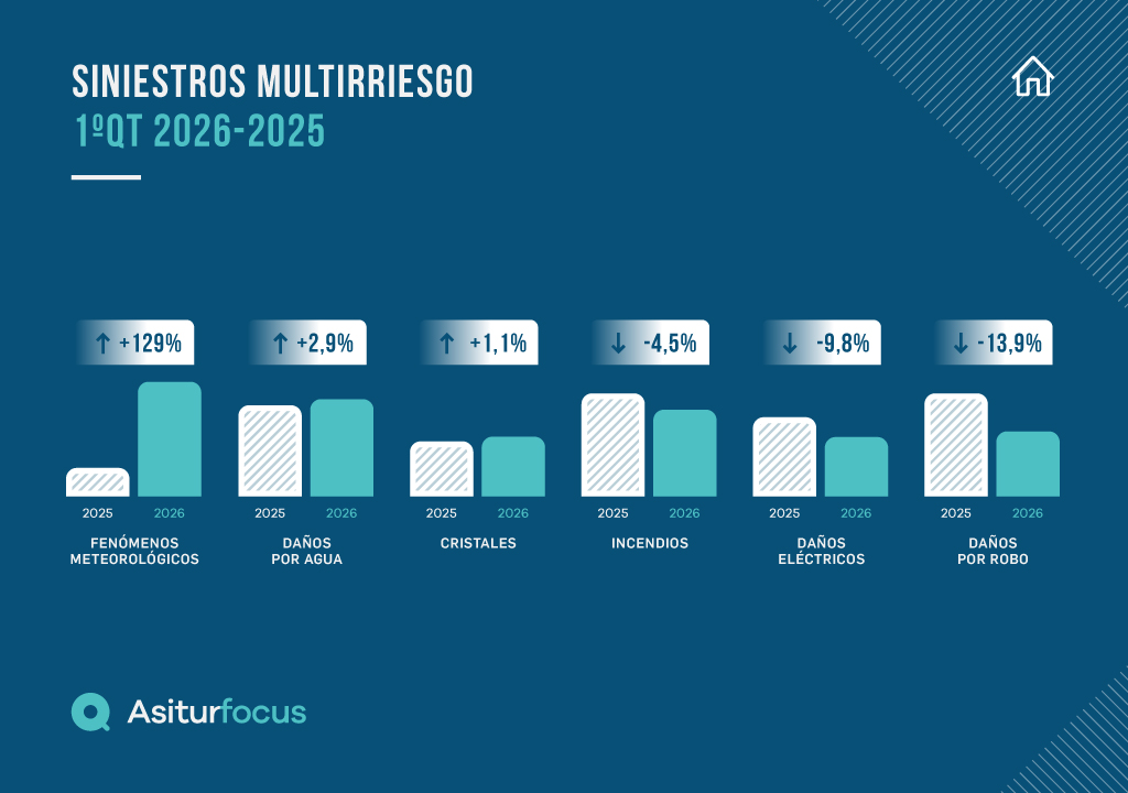 Según el Observatorio Asitur Focus, los siniestros en el conjunto de los seguros Multirriesgo han crecido un 16,3% en este periodo respecto al mismo periodo del al ejercicio anterior. Con todo, pese al aumento global de la siniestralidad, la mayoría de las tipologías presentan descensos respecto a 2025 y solo tres categorías rompen esta tendencia: rotura de cristales, con un ligero crecimiento del 1,1%; daños por agua, que aumentan un 2,9% y daños por fenómenos meteorológicos, que se disparan un 129%, convirtiéndose en el principal motor del repunte registrado en el periodo. El mayor incremento se ha producido en las pymes (23,7%) seguido de Comunidades con el 21,9%.