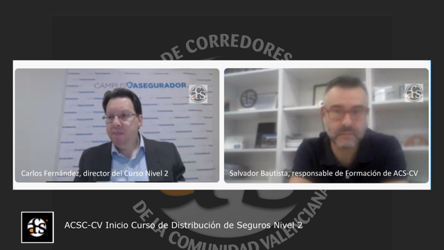 ACS-CV ha iniciado el curso de Distribución de Seguros Nivel 2 en un acto online durante el cual también se impartió la primera clase. La asociación se adapta así a las nuevas exigencias legales en materia de formación para seguir ofreciendo una formación de calidad que habilite para poder trabajar en despachos de correduría, que emana de la legislación europea. Este curso cuenta con el aval de la Generalitat Valenciana, tal como recordó en la presentación Salvador Bautista, responsable de Formación de ACS-CV y se trata del primer curso Nivel 2 que se celebra en la Comunidad Valenciana.