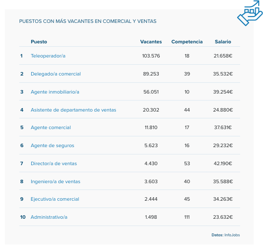 En esta categoría de 'Comercial y ventas', solo acumularon más vacantes estos perfiles: teleoperador (103.576), delegado comercial (89.253), agente inmobiliario (56.051), asistente de departamento de ventas (20.302) y agente comercial (11.810).