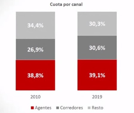 En estos últimos 10 años, tanto agentes como corredores han ganado peso en la intermediación del seguro de Autos. Desde 2010, los agentes han aumentado ligeramente su posicionamiento en el mercado (0,3 puntos) y continúan como líderes absolutos. Si bien, los corredores acechan ya que, en la última década, han ganado casi 4 puntos de cuota de mercado y ya controlan el 30,6% del negocio. "Agentes y corredores se han posicionado mejor como canales de distribución", afirmó José Manuel Inchausti.