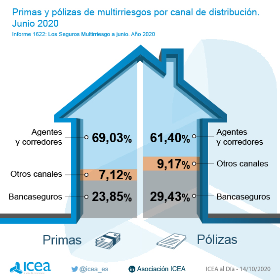 El conjunto del ramo de Multirriesgos es territorio exclusivo de la mediación tradicional. Según datos facilitados por ICEA a través de su boletín semanal, agentes y corredores han intermediado el 69,03% de las primas durante el primer semestre de 2020, muy por encima de lo que ha distribuido su principal competidor: la bancaseguros (23,85%).