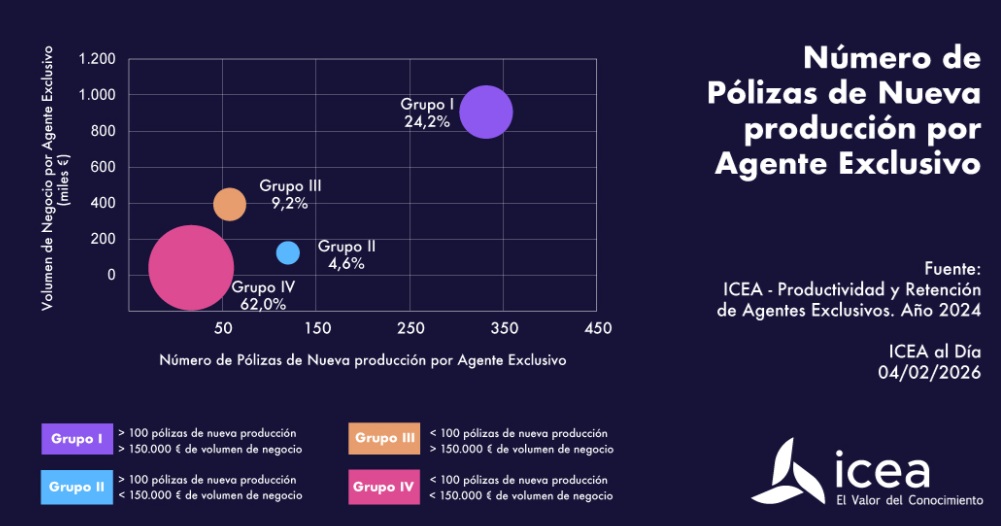 Un 24,2% de los agentes exclusivos gestiona el 81,3% de las primas de nueva producción, según datos extraídos del informe 'Productividad y retención de agentes exclusivos. Año 2024' elaborado por ICEA. Se trata, en concreto, de los agentes incluidos en el denominado Grupo I, los de mayor tamaño cuyo volumen de negocio se coloca entre los 800 y 1.000 millones de euros. Este Grupo llega a alcanzar -y superar- las 332 pólizas de nueva producción al año y con una media de 905.643 euros de primas de volumen de negocio al año.