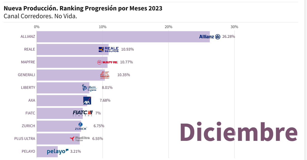 El time lapse permite observar cómo fue la evolución de comercialización de estos seguros hasta finalizar el año con Allianz, Reale y Mapfre en los primeros lugares. Durante el año se comprueba que la mayoría de las ventas de nueva producción por parte de los corredores de seguros se realizaban con la aseguradora Allianz, incluso triplicando los porcentajes con el resto.