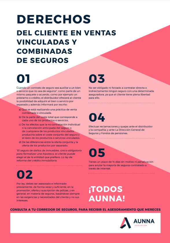 Aunna ha elaborado una serie de materiales gráficos explicando los derechos que tienen los clientes a la hora de contratar sus seguros, haciendo especial hincapié en las ventas vinculadas y combinadas. La asociación ha enviado estos documentos a sus socios para que sean conscientes de que los consumidores mantienen vigentes todos sus derechos en estos tiempos de pandemia por Covid-19.