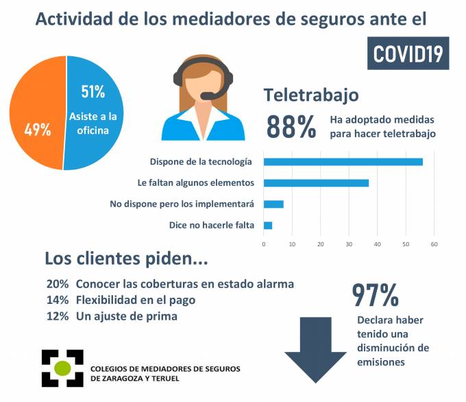 Aunque el 100% de los mediadores colegiados de Zaragoza y Teruel han seguido trabajando durante la situación provocada por el Covid-19, hasta el 97% han visto disminuir su actividad. Y un 37,3% han recibido comunicaciones de sus clientes indicando su intención de anular algún seguro.