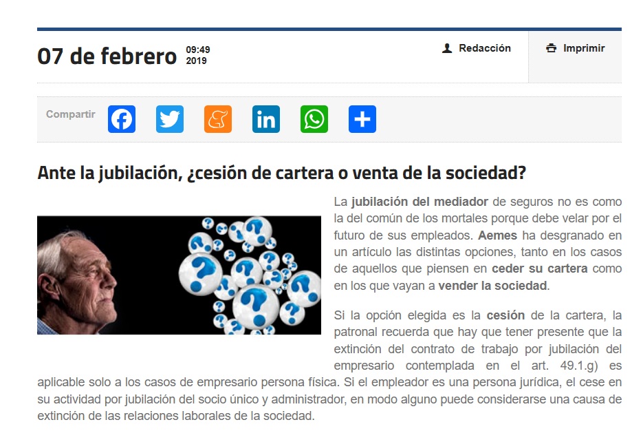 Seguimos avanzando, y el TOP 3 de noticias de Carta del Mediador más difundidas ha sido "Ante la jubilación, ¿cesión de cartera o venta de la sociedad?" publicada en febrero de 2019 y que 7 años después sigue siendo uno de los temas de máxima actualidad, en un momento en el que la mediación está en plena transformación y son continuos los movimientos en el sector.
