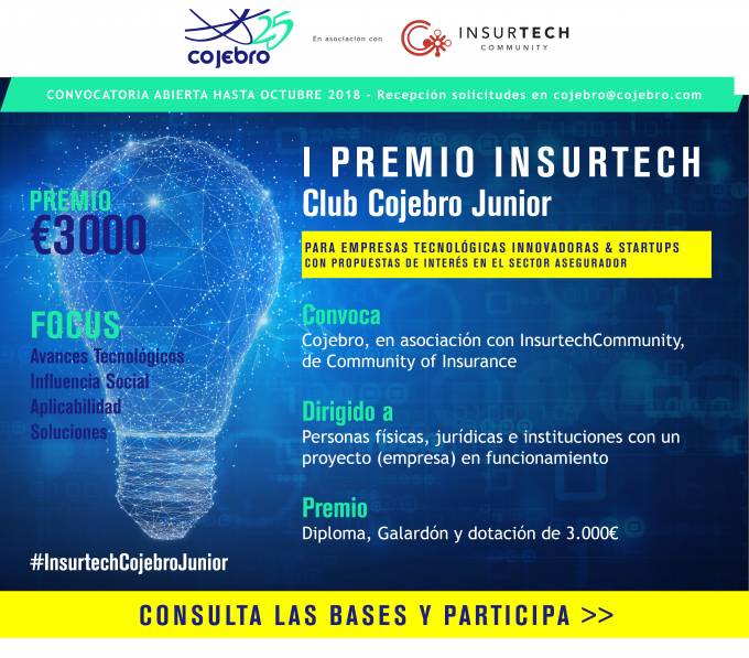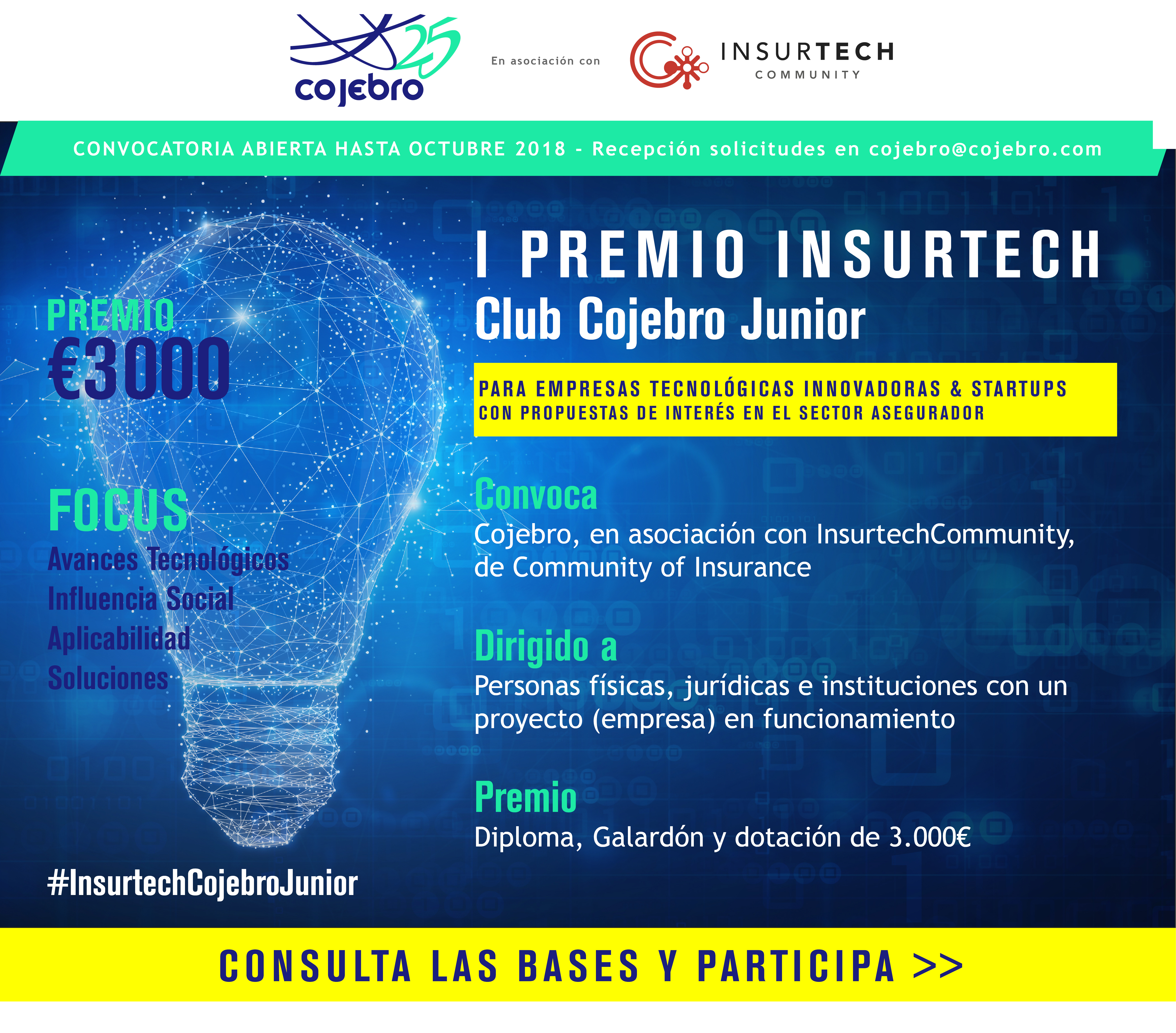 Cojebro, en asociación con Insurtech Community, ha creado la 1ª edición del Premio Insurtech Club Cojebro Junior para premiar proyectos tecnológicos innovadores de interés para el sector asegurador, dotado con 3.000 euros. Los finalistas son: Adtuo, Avalvida, Forcemanager, Lisa, Minalea, Mondo, Monuma, Gistek, Servicio e-Compliance, Software Gecko, Visualeo yWinp3. La entrega del premio se efectuará en el Casino de Madrid, el 22 de noviembre de 2018, en el acto oficial de clausura del 25 aniversario de Cojebro.