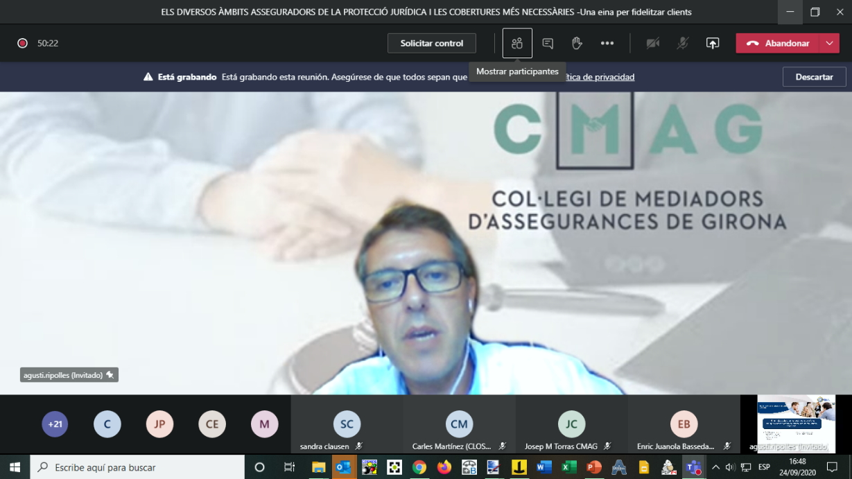 El Colegio de Mediadores de Girona ha organizado una webinar para analizar el ramo de Defensa Jurídica. La institución ha querido formar a los colegiados interesados puesto que de manera continuada y año tras año "hay un incremento de las reclamaciones y de los litigios a todos los niveles", justifica el colegio. Afirma que en una sociedad que crece en complejidad "se hace más necesario que nunca poder disponer o tener acceso a una protección jurídica para poder hacer valer nuestros derechos, tanto de reclamación como de defensa".
