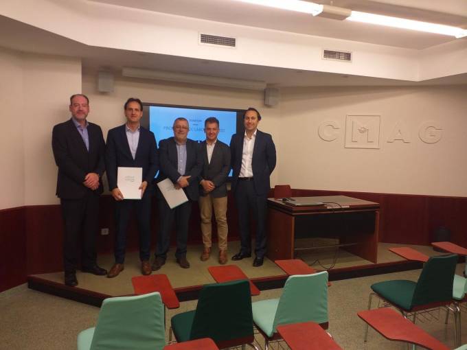 La firma del protocolo contó con el presidente del Colegio, Jordi Triola, y por parte de la aseguradora Ignacio López, director de Canales Mediados y de Territoriales; Sergio Biescas, director Territorial Catalunya, Balears y Andorra; Enric Llahí, director Provincia Girona; y Juan Carlos Campoy, consultor Provincia Girona-.