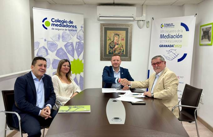 El Colegio de Granada y DKV extienden su colaboración un año más. El acuerdo firmado por el presidente del Colegio, Genaro Sánchez, acompañado de su vicepresidenta, Laura Molero, y por José Manuel Lara Palma, director Sucursal de Granada y Jaén de la aseguradora, y Pedro Miguel Parra Montoro, Consultor Red Corredores, aboga por seguir apoyando a los mediadores de la provincia de Granada. DKV podrá participar si así lo desea en los actos organizados por el Colegio en este período, así como poder organizar los suyos propios dirigiéndolos a los colegiados.