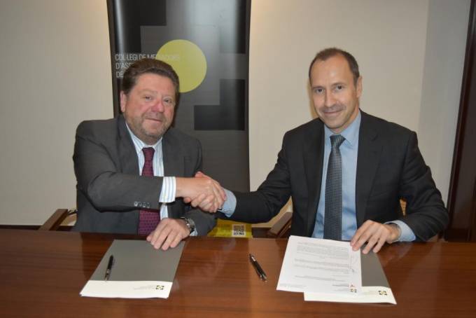 Javier Barberá, presidente del Colegio, y Miquel Corteganos, director territorial de Catalunya y Aragón de Plus Ultra Seguros, han sido los encargados de la firma.
