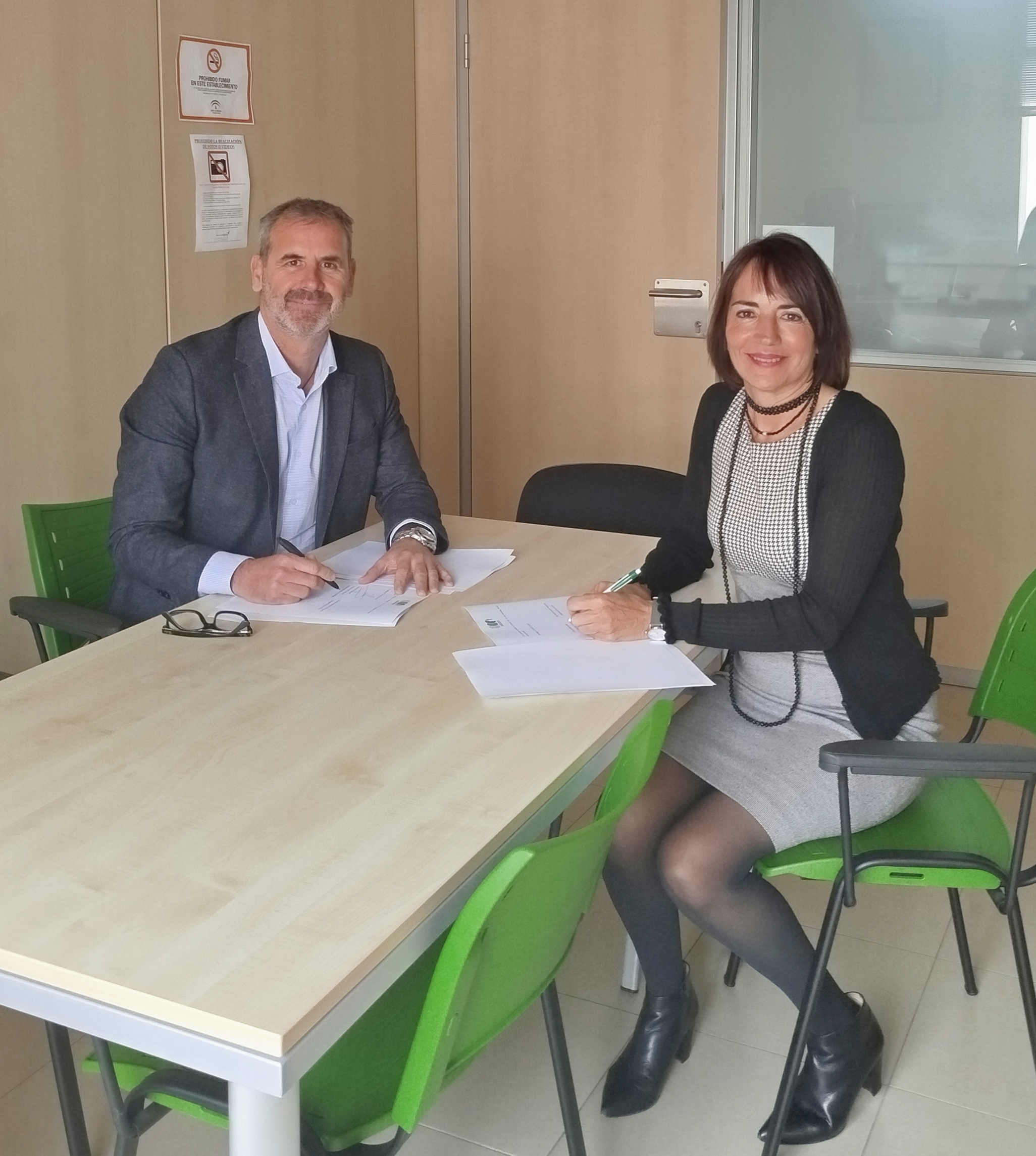 La firma de este acuerdo contó con la presencia de Benito Rius, presidente del Colegio, y María Jesús Bravo, delegada comercial de ARAG en Málaga.