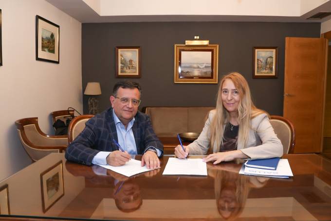 La firma del convenio fue suscrito por Reyes Gómez, responsable comercial de Aragón de Salus Seguros, y Miguel de las Morenas, presidente del colegio.
