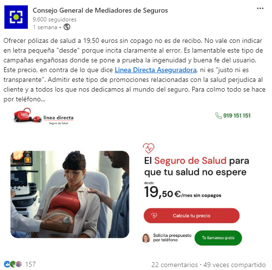 Hace una semana, el Consejo General ya mostró en sus redes sociales su enfado contra esta campaña. En LinkedIn, publicó un post en el que se leía lo siguiente: "Ofrecer pólizas de salud a 19,50 euros sin copago no es de recibo. No vale con indicar en letra pequeña 'desde' porque incita claramente al error. Es lamentable este tipo de campañas engañosas donde se pone a prueba la ingenuidad y buena fe del usuario".