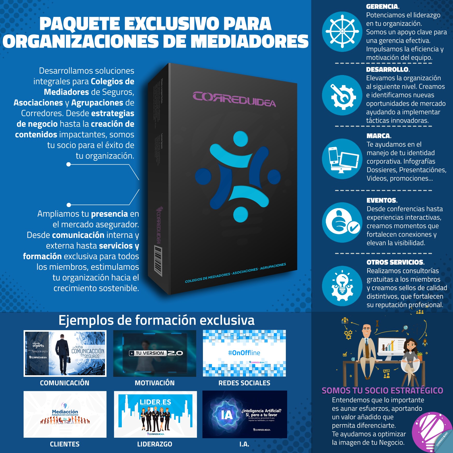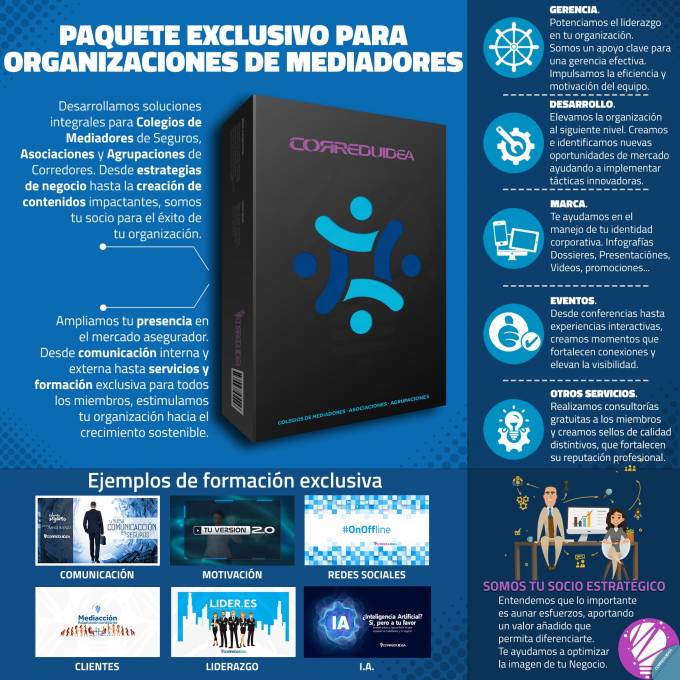 Correduidea presenta a las organizaciones de corredores -colegios, asociaciones y otras agrupaciones- un paquete integral de servicios de gestión que abarca desde estrategias de negocio personalizadas hasta la creación de contenidos de alto impacto. "Nuestro objetivo es potenciar el liderazgo de nuestros clientes en su mercado, proporcionando herramientas y servicios que impulsan la eficiencia y la motivación de sus equipos", afirma Mamen Sáez, directora de Correduidea.