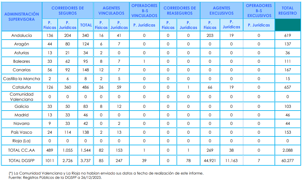 Así, a 26 de diciembre de 2023, estaban dados de alta en España un total de 62.365 mediadores, sin contar los anotados en La Rioja y Comunidad Valenciana, que no habían enviado a la DGSFP sus datos a fecha de realización de este informe. Por tanto, respecto al ejercicio 2022, el colectivo ha menguado un 3%, que se traduce en 1.895 profesionales menos ya que el pasado año terminó con 64.260 mediadores registrados según los datos publicados por la DGSFP.
