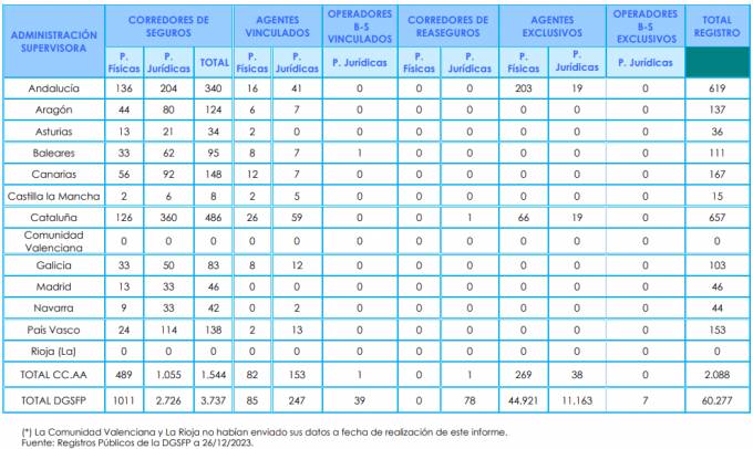 De estos 2.088 mediadores, 1.544 son corredores o corredurías, lo que significa que en el último año se han dado de baja 18 profesionales del corretaje. Mientras, se mantiene el mismo corredor de reaseguro bajo supervisión autonómica, que pertenece a Cataluña. En cuanto al canal agencial, las comunidades autónomas supervisan a 235 agentes vinculados (5 más que en 2022) y a 307 agentes exclusivos (+9). Por último, continúa un OBS vinculado en el registro de Baleares.
