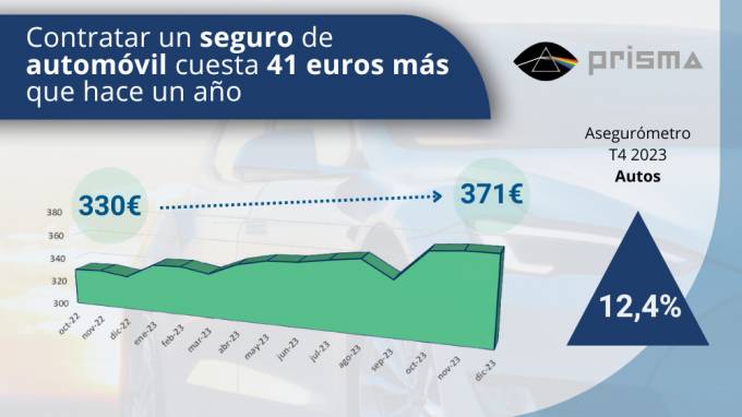 Según el Observatorio Prisma, que analiza 1,4 millones de pólizas, la prima media en el cuarto trimestre se sitúa en 376 euros, lo que indica un aumento del 6,8% con relación al mismo periodo del pasado año. El precio medio de la renovación de cartera se incrementó en un 5,3% hasta los 377 euros, mientras que para la nueva producción el aumentó es del 12,4% (41 euros) hasta los 371 euros frente a los 330 de un año antes.